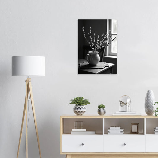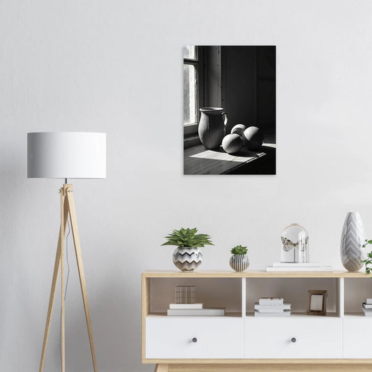 Rustige Zwart-Wit Stilleven met Vaas en Zonlicht