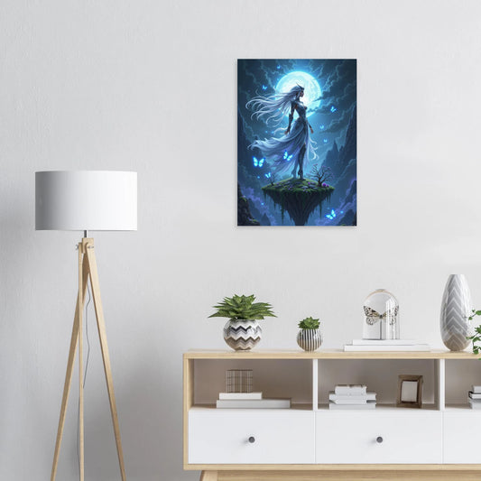 Mystieke Vrouw met Wit Haar op Zwevend Eiland onder Maanlicht