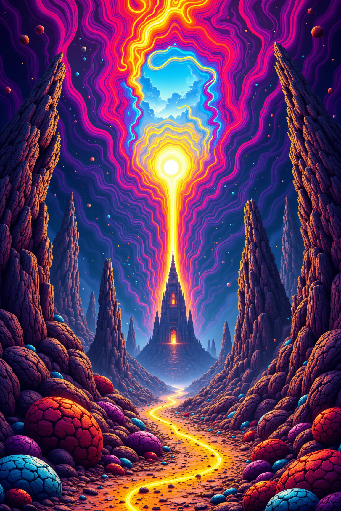 Step into another dimension with 'Cosmic Gateway'. This stunning piece captures an otherworldly landscape where vibrant energies swirl through a fantastical realm. A glowing path leads towards a mysterious structure, bathed in the light of a celestial portal erupting in psychedelic colors across the cosmos.