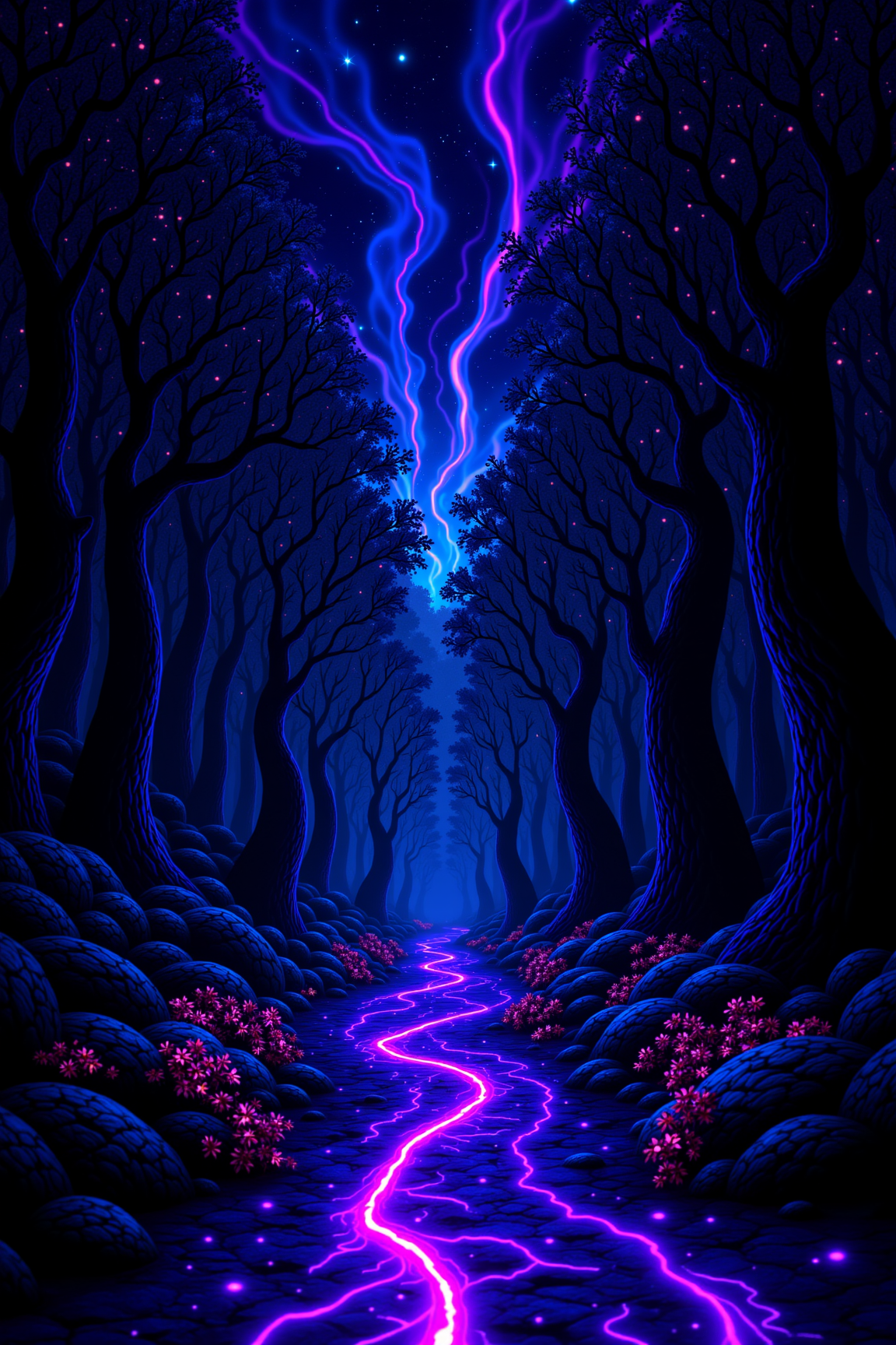 Follow the 'Electric Current,' a breathtaking path carved through a deep, mystic forest by a river of crackling magenta energy. Ancient trees stand sentinel, bathed in an ethereal blue and pink glow emanating from the cosmic energy overhead. Delicate pink blossoms line the banks, adding a touch of softness to the vibrant, untamed magic.