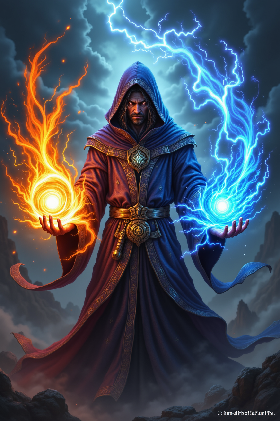 Witness the awe-inspiring power of elemental mastery. This stunning AI-generated artwork depicts a formidable mage harnessing the raw energy of fire and lightning. Caught between storm clouds and rugged peaks, the wizard stands as a figure of immense arcane power, embodying the epic clash of primordial forces. A perfect centerpiece for fantasy enthusiasts seeking dramatic and powerful visuals.