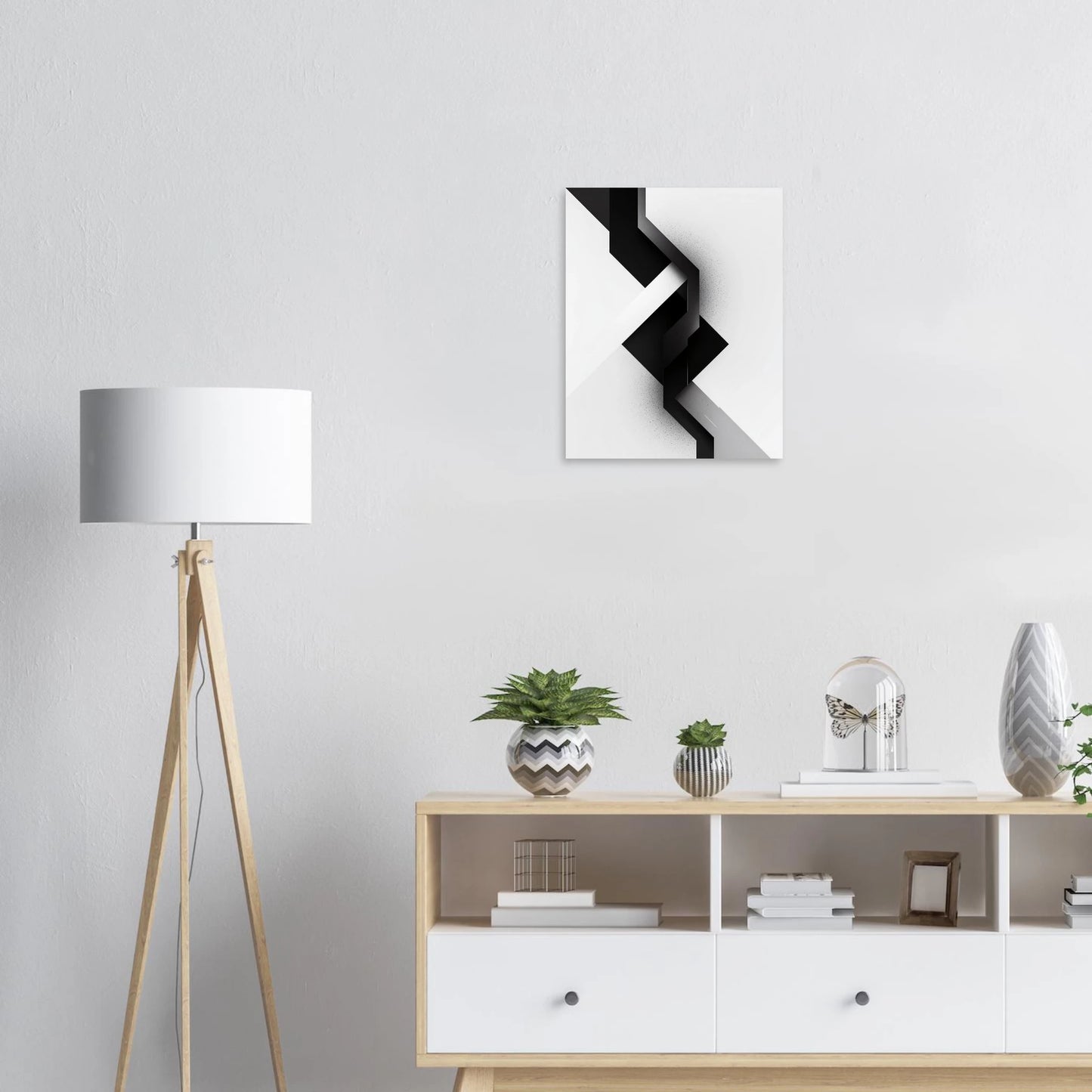 Laat je onderdompelen in een minimalistische monochrome abstractie die gelaagde geometrische vormen van cirkels, lijnen en rechthoeken harmonieus samenbrengt. Uitgevoerd in krachtige zwart-, wit- en verschillende grijstinten, toont deze compositie moderne grafische kunst met een scherpe, schone uitstraling. Het samenspel van vormen en negatieve ruimte creëert een gedurfde, contemplatieve sfeer, perfect voor verfijnde eigentijdse interieurs die subtiele diepte en gestructureerde elegantie zoeken.