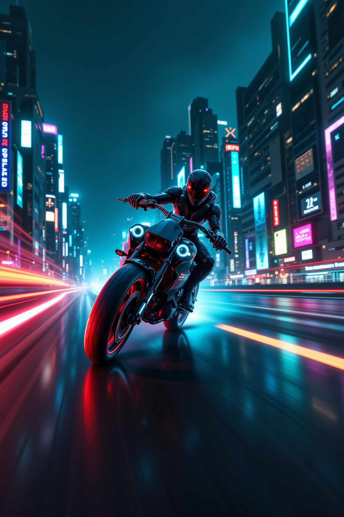 Clad in sleek black armor, the rider's glowing red eyes pierce the darkness, guiding a powerful machine down rain-slicked roads. Vibrant neon signs from towering skyscrapers blur into streaks of cyan and magenta, reflecting the high-octane velocity.