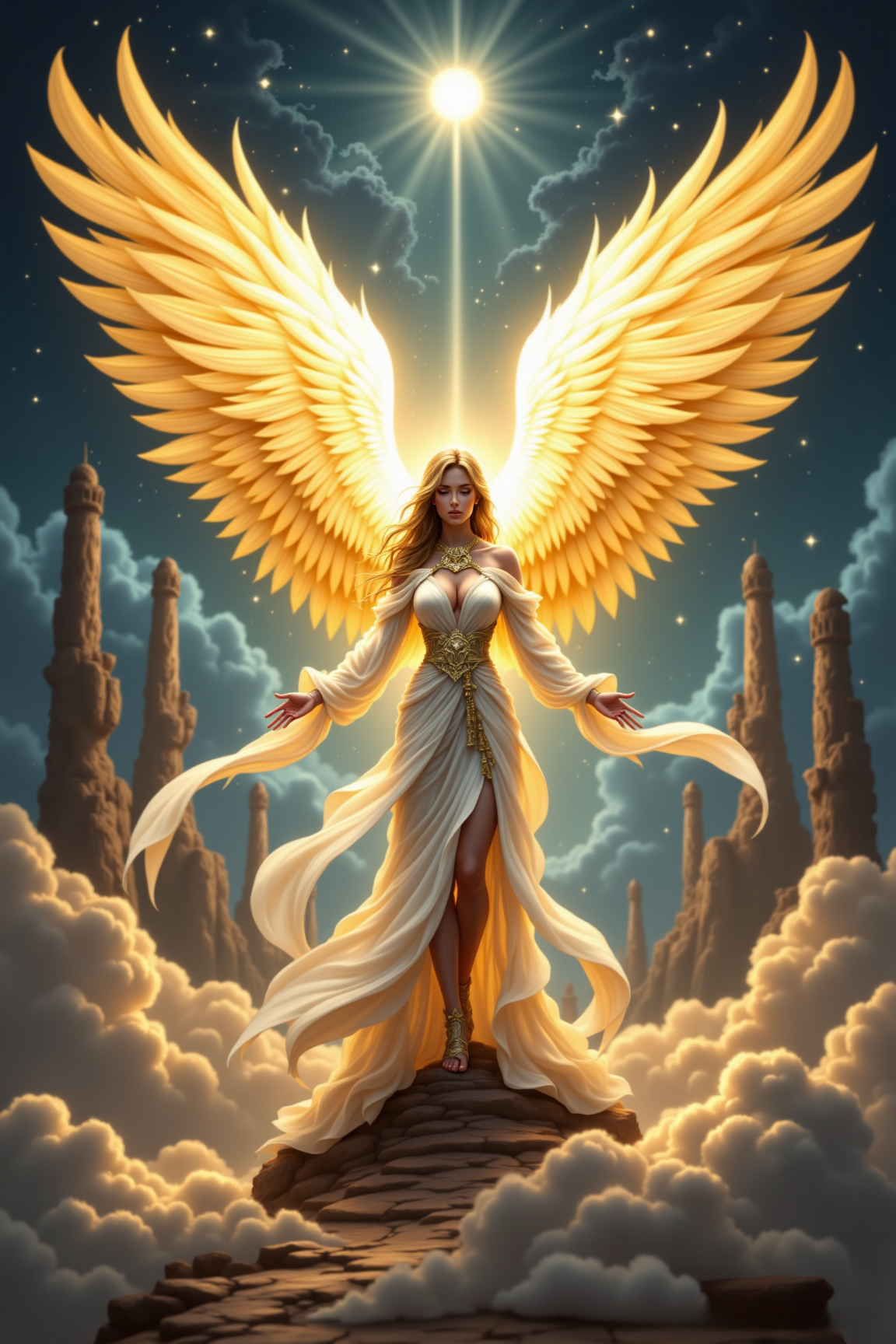 The intricate details of the flowing gown and the soft glow emanating from the heavens create a sense of awe and wonder. Perfect for adding a touch of serenity and inspiration to any space, this piece invites contemplation and elevates the atmosphere with its gentle yet commanding presence. Let this captivating AI-generated vision bring a feeling of calm and celestial grace into your home or office.