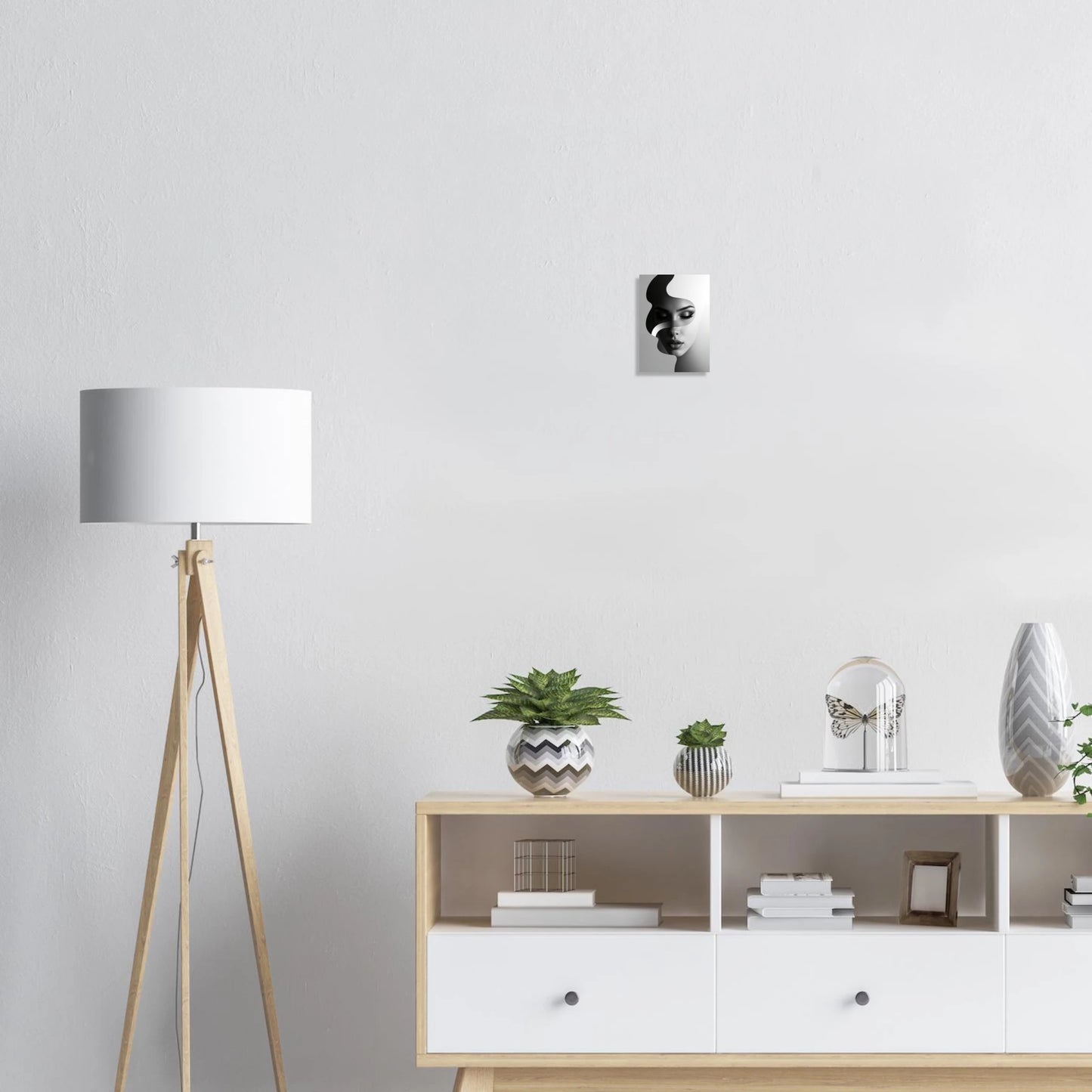Ontdek dit fascinerende surrealistische portret van een vrouw met gesloten ogen, gedeeltelijk verborgen door gelaagde abstracte vormen in krachtige zwart-, wit- en grijstinten. De minimalistische en monochrome compositie combineert een betoverende schoonheid met grafische intensiteit, die een diep gevoel van mysterie en introspectie oproept. Perfect voor liefhebbers van eigentijdse surrealistische en abstracte portretten die op zoek zijn naar een verfijnd pronkstuk.