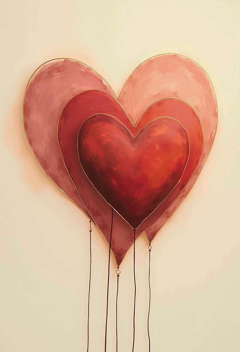 Experience the simple elegance of affection with this minimalist artwork. Three nested hearts, rendered in warm shades of pink and deep red with delicate gold outlines, create a beautiful symbol of growing love. The layered design adds depth and warmth, making it a subtle yet impactful statement piece. Ideal for adding a touch of romance or gentle color to any space.