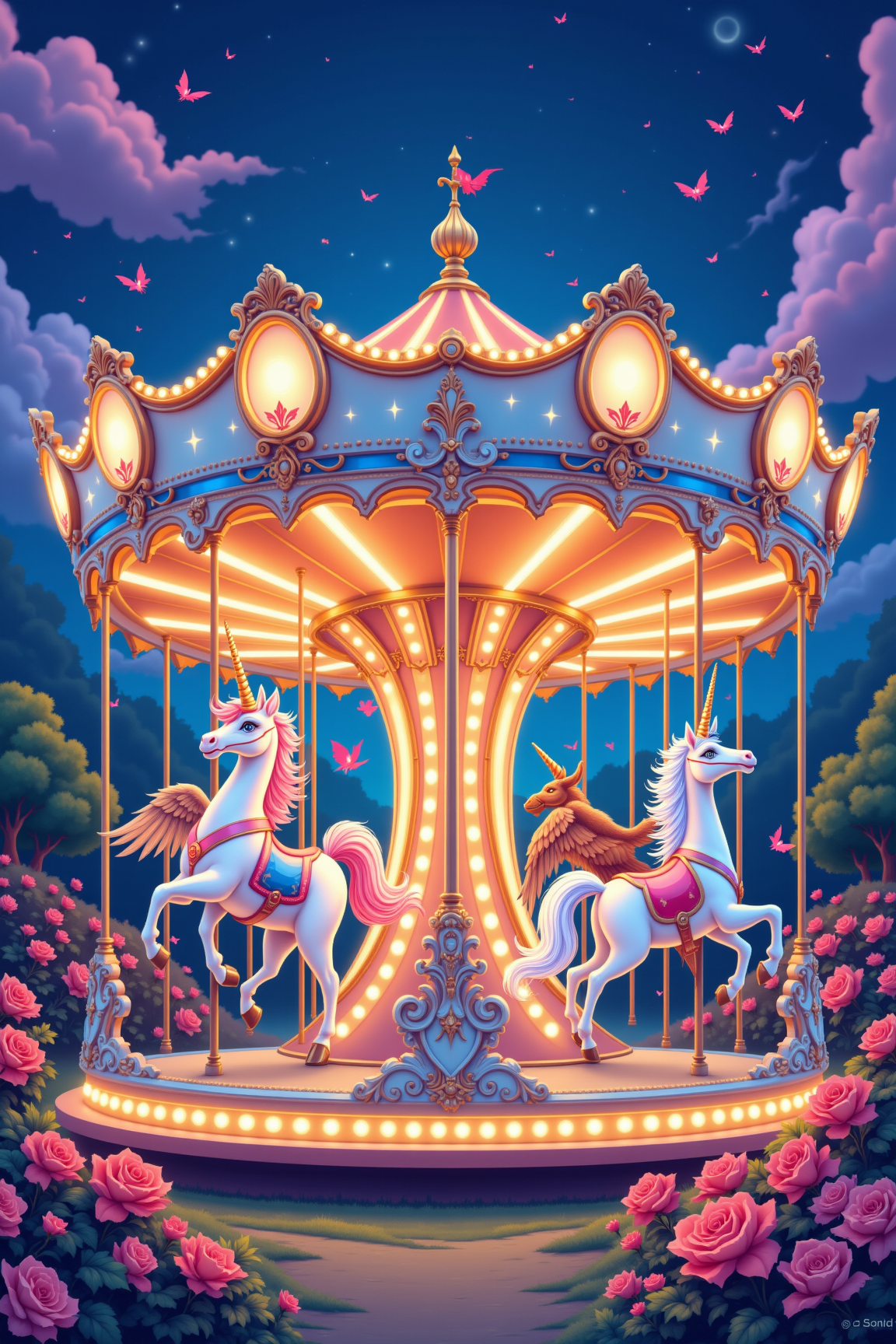 Step into a whimsical dreamscape with this enchanting carousel scene. Under a starry twilight sky filled with soft clouds and fluttering pink butterflies, majestic unicorns and winged pegasi come to life in a symphony of light and color. Surrounded by lush pink roses, this magical merry-go-round glows with warmth, inviting wonder and imagination. A perfect piece to add a touch of fantasy and delight to any room, especially for those who adore mythical creatures and fairytale charm.