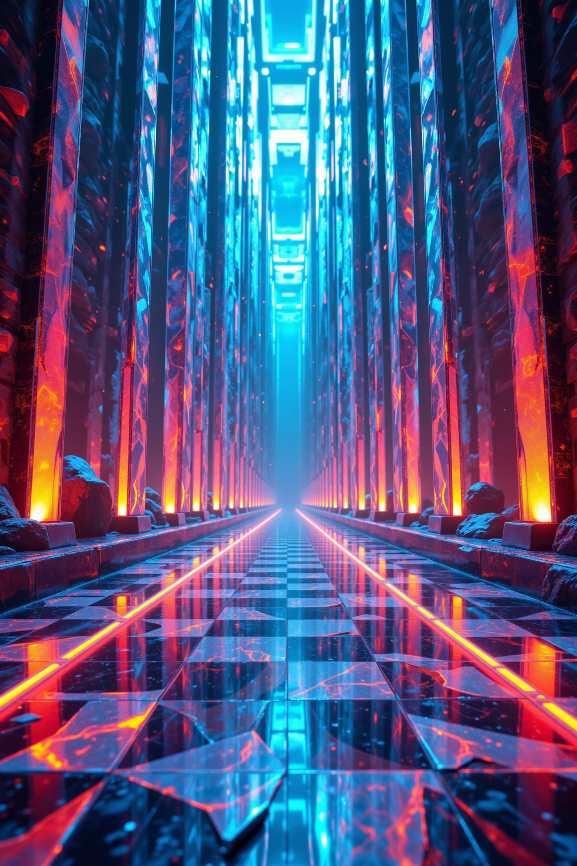 Hoge, imposante pilaren, gloeiend met vurig oranje van onderen en koel cyaan reflecterend van boven, markeren de weg. De sterk reflecterende geblokte vloer weerspiegelt dit dramatische samenspel van licht, wat een betoverend gevoel van diepte en perspectief creëert. Stap binnen in een rijk van opvallende architectonische schoonheid en futuristisch mysterie.