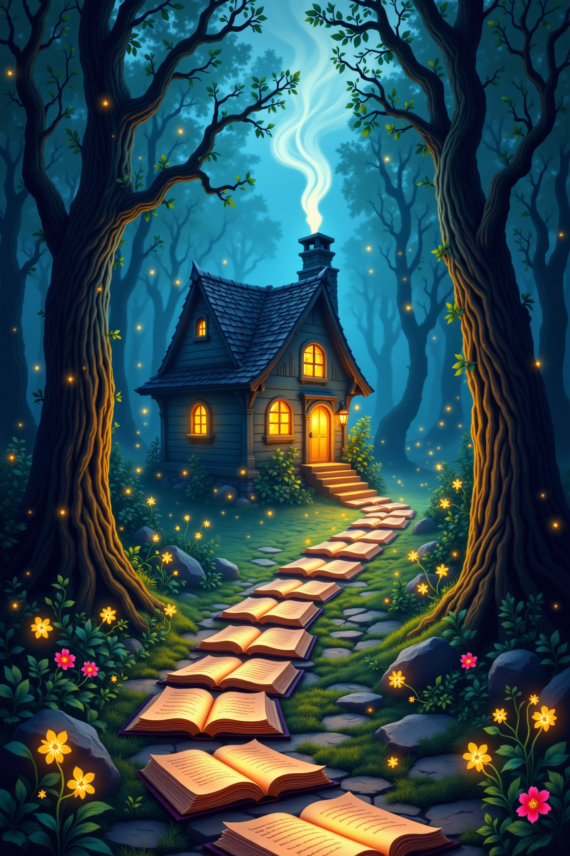 Volg het magische pad van open boeken, elke bladzijde gloeiend met onvertelde verhalen, die je leiden naar een toevluchtsoord van verbeelding en verwondering. Rook kringelt uitnodigend uit de schoorsteen, hintend naar warmte en verhalen binnenin.